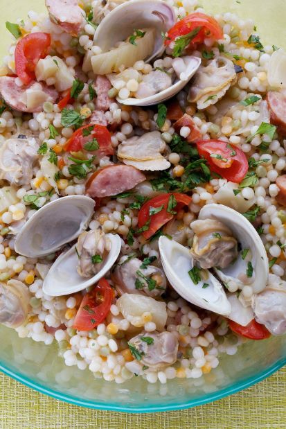 Couscous is a north african dish made from tiny steamed balls of semolina flour.